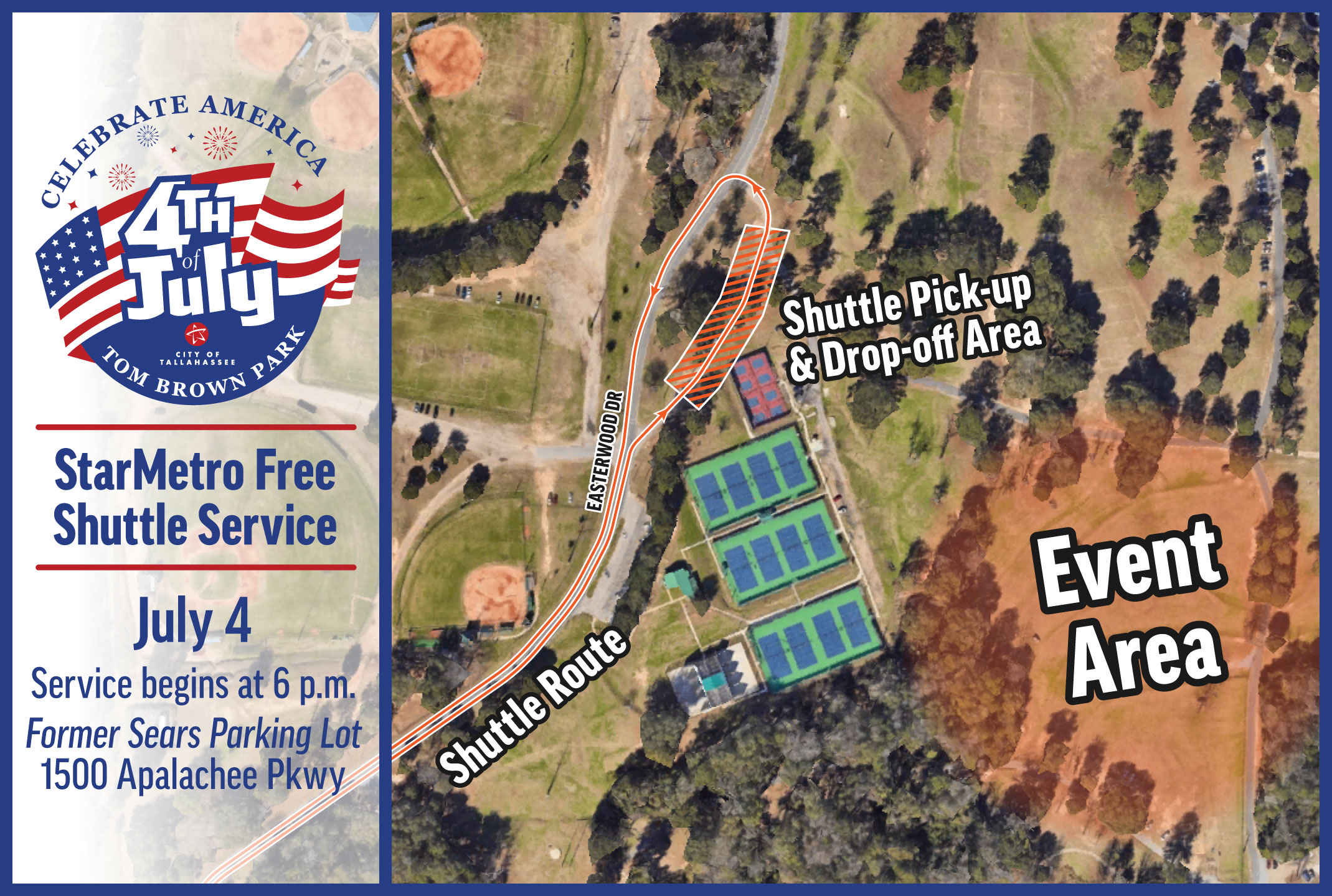Since there is limited parking within the park, StarMetro, the City's public transportation department, will provide free shuttle service for the event, picking riders up in the parking lot at the former Sears, 1500 Apalachee Parkway. Dial-A-Ride will be available on the same shuttle route. Shuttle service to Tom Brown Park begins at 6 p.m. and will end at 8:30 p.m. Shuttles will begin running for return service from Tom Brown Park to the former Sears parking lot following the fireworks show with service ending around 11 p.m. Shuttle service will not be operational during the fireworks show. For handicap parking within the park, be sure to bring your placard and check with a parking attendant upon arrival at Tom Brown Park for assistance.